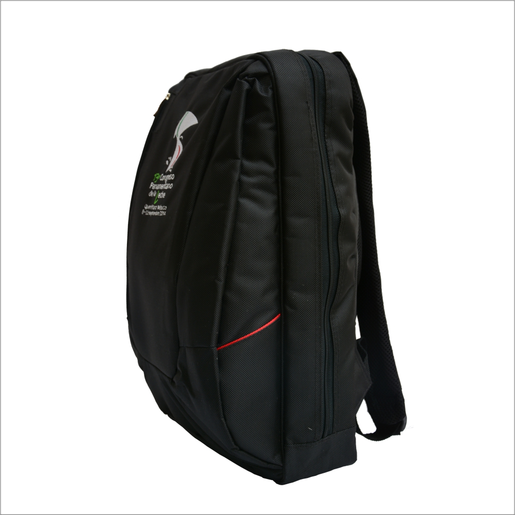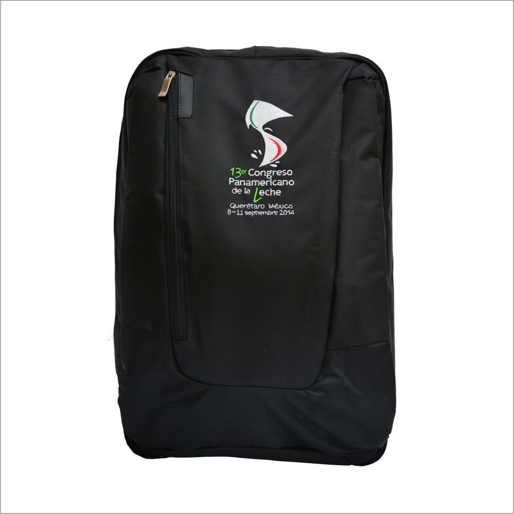 MOCHILA CONGRESO LACTEOS CON BOLSA FRONTAL, CARTERA FRONTAL, ESPALDA ACOLCHONADA, FORRADA Y ACOLCHONADA, CARTERA Y ACCESORIOS INTERNOS.